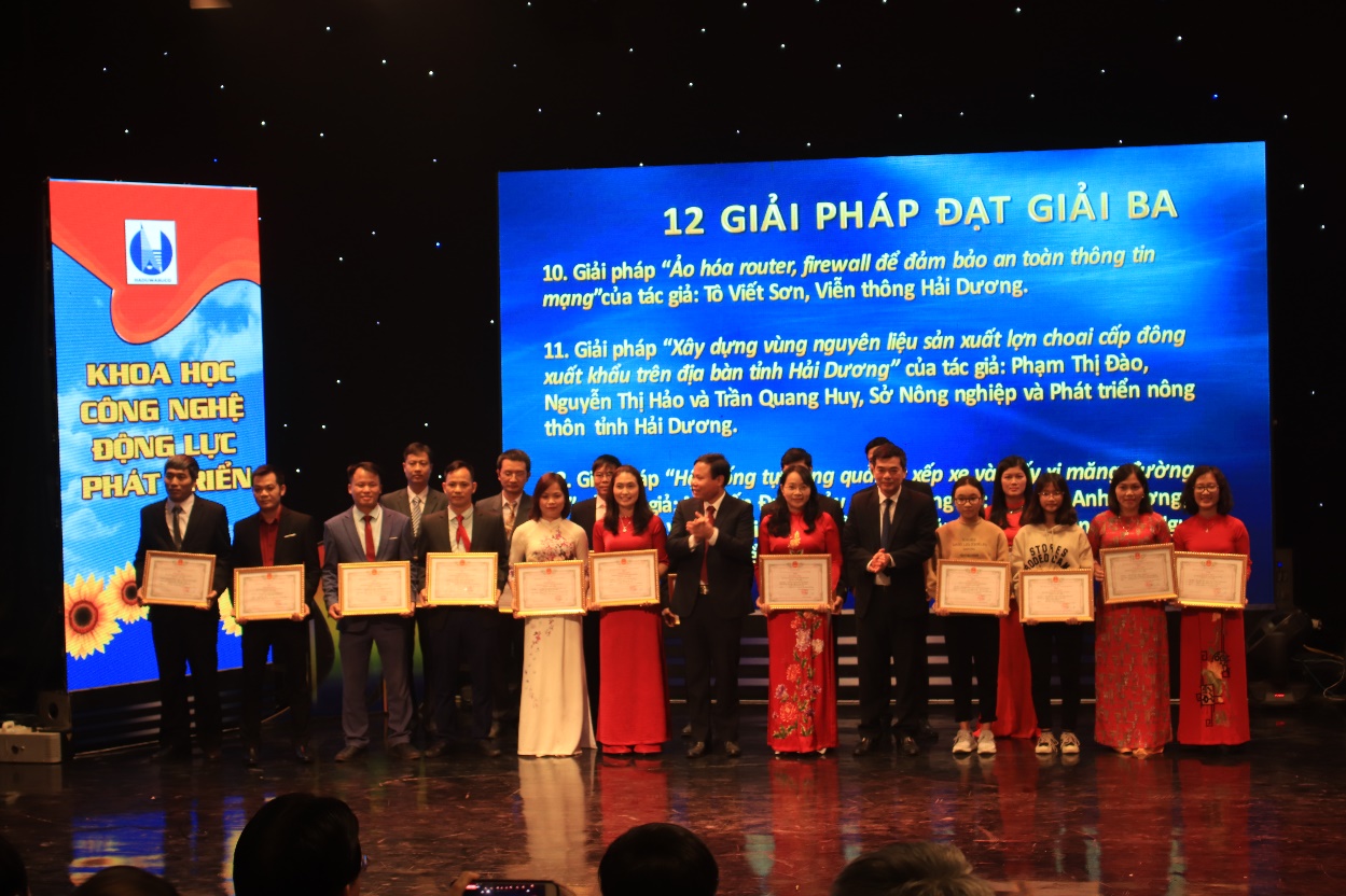 TS. Nguyễn Trọng Các (thứ 3 từ trái qua), TS. Lê Ngọc Hòa (thứ 4 từ trái qua) - Đại diện nhóm tác giả nhận giải Ba Hội thi Sáng tạo kỹ thuật tỉnh Hải Dương lần thứ XI (2018-2019)
