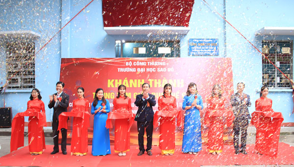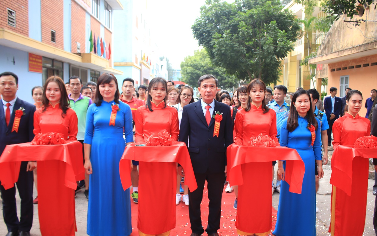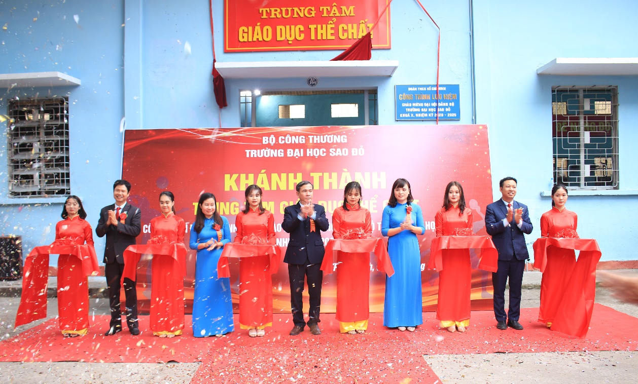 NGND. TS Đinh Văn Nhượng – Hiệu trưởng (đứng thứ tư từ phải sang), TS. Nguyễn Thị Kim Nguyên – Phó Hiệu trưởng, Chủ tịch Công đoàn trường (đứng thứ hai từ phải sang) cắt băng khánh thành Trung tâm Giáo dục thể chất Trường Đại học Sao Đỏ