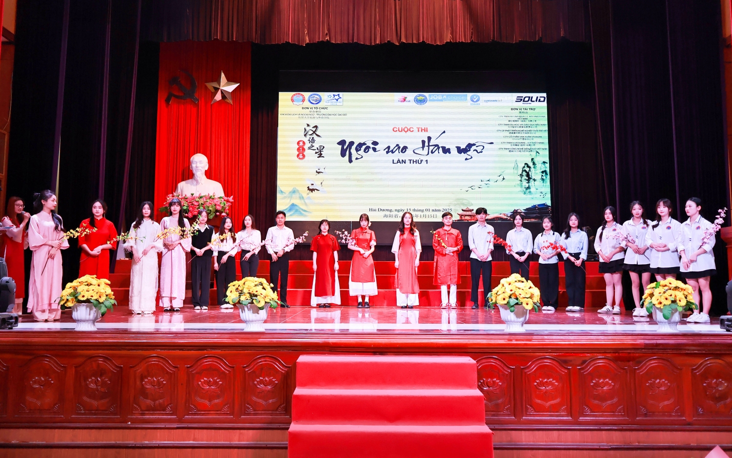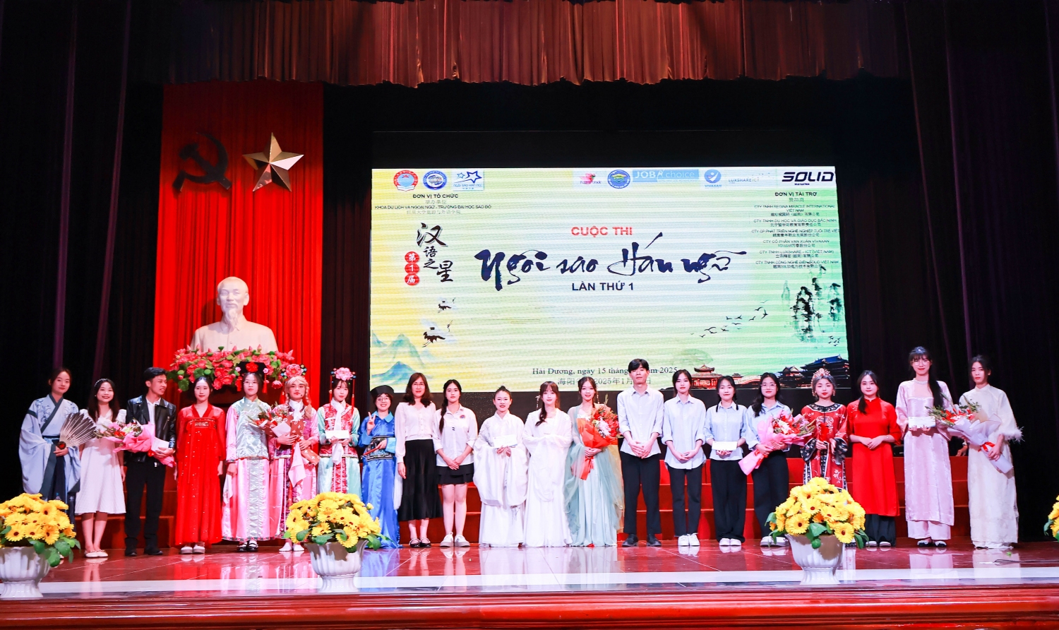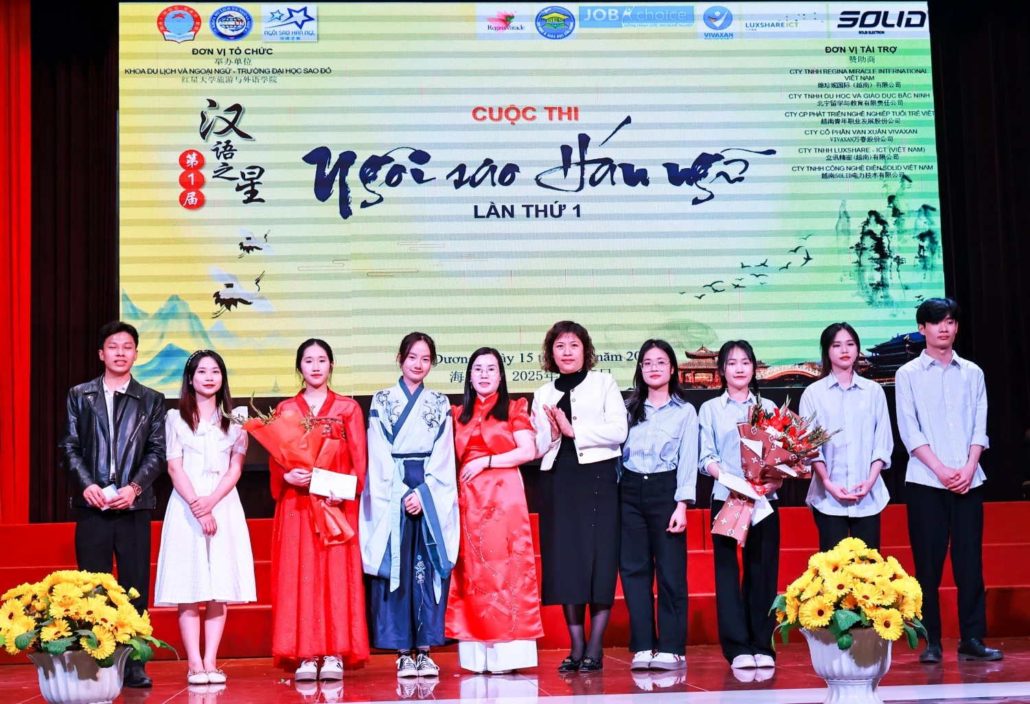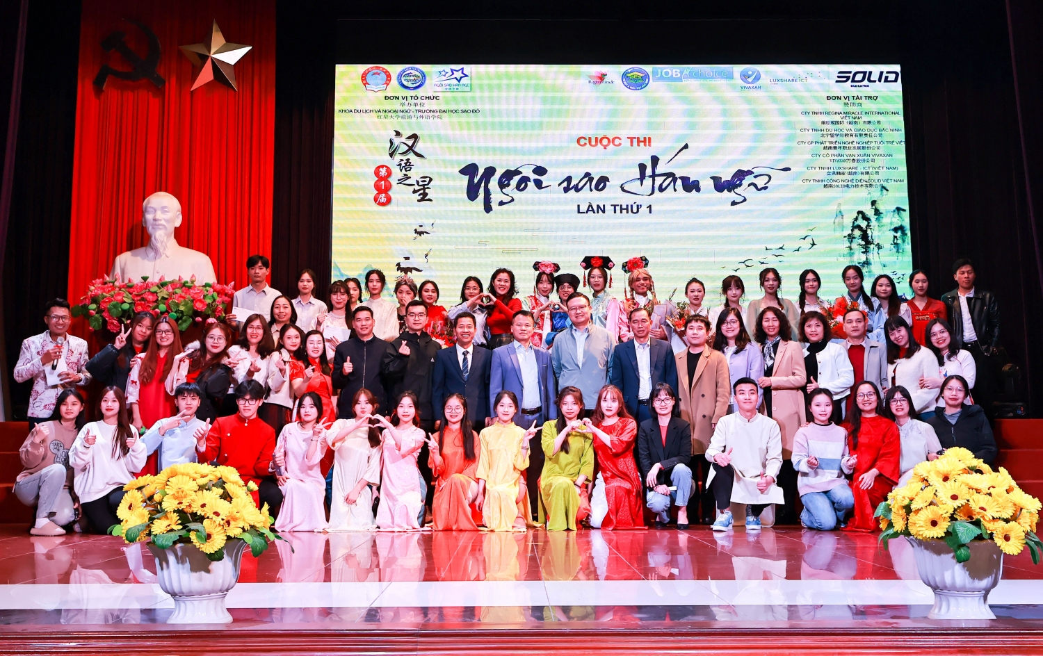 Đại diện lãnh đạo Trường Đại học Sao Đỏ, đại diện đơn vị tài trợ, các thầy cô và sinh viên khoa Du lịch và Ngoại ngữ chụp lưu niệm tại cuộc thi