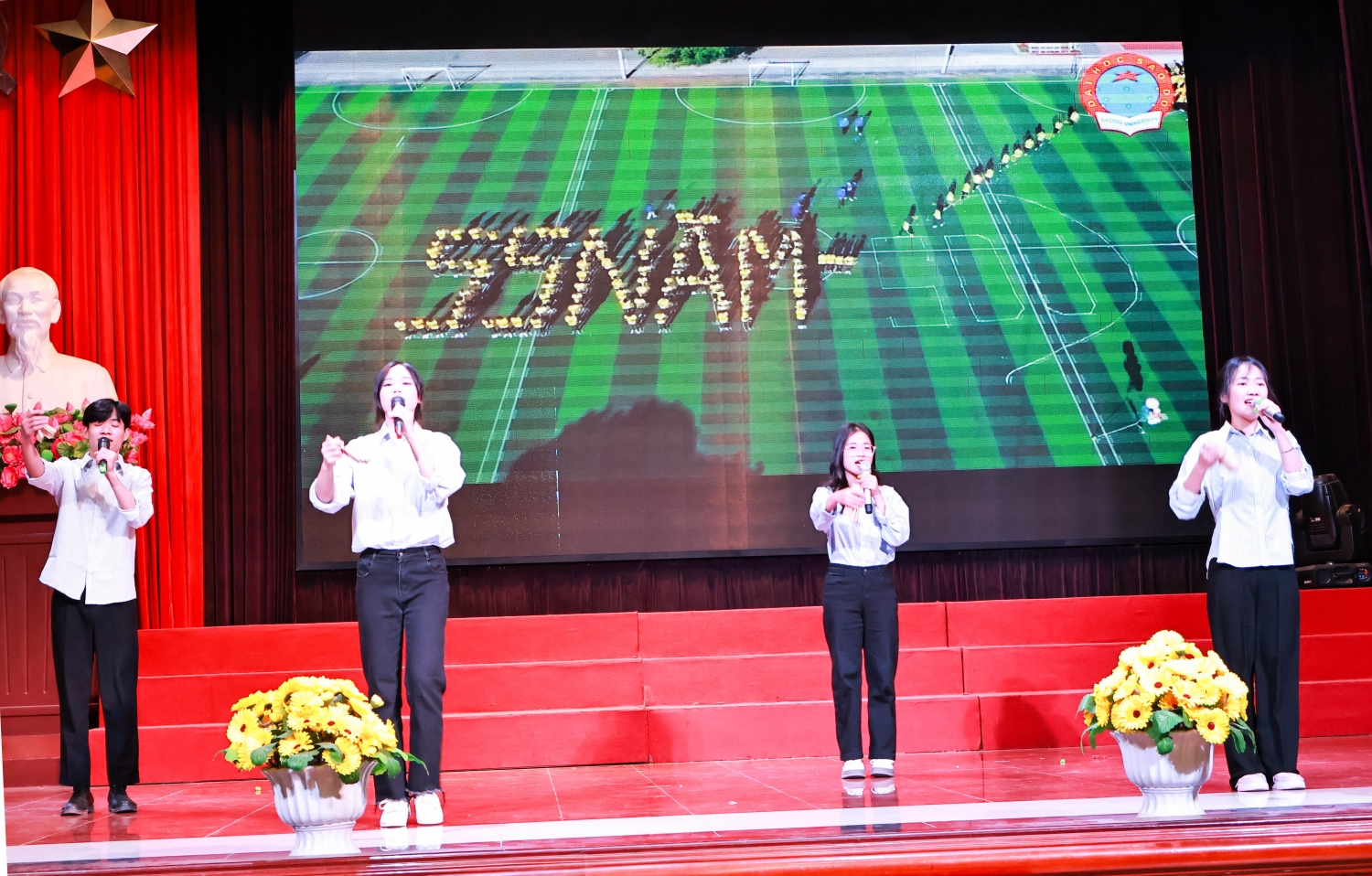 NGƯT. TS Nguyễn Trọng Các và NGƯT. TS. Nguyễn Thị Kim Nguyên đại diện lãnh đạo Trường Đại học Sao Đỏ tặng hoa tri ân đại diện các đơn vị tài trợ