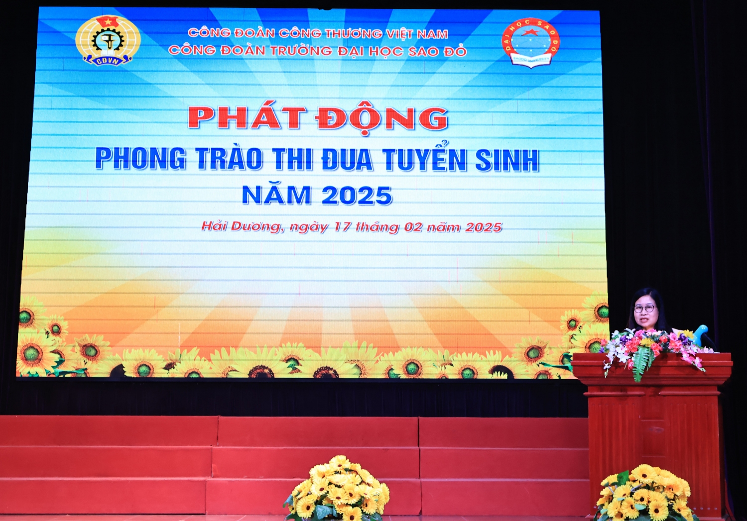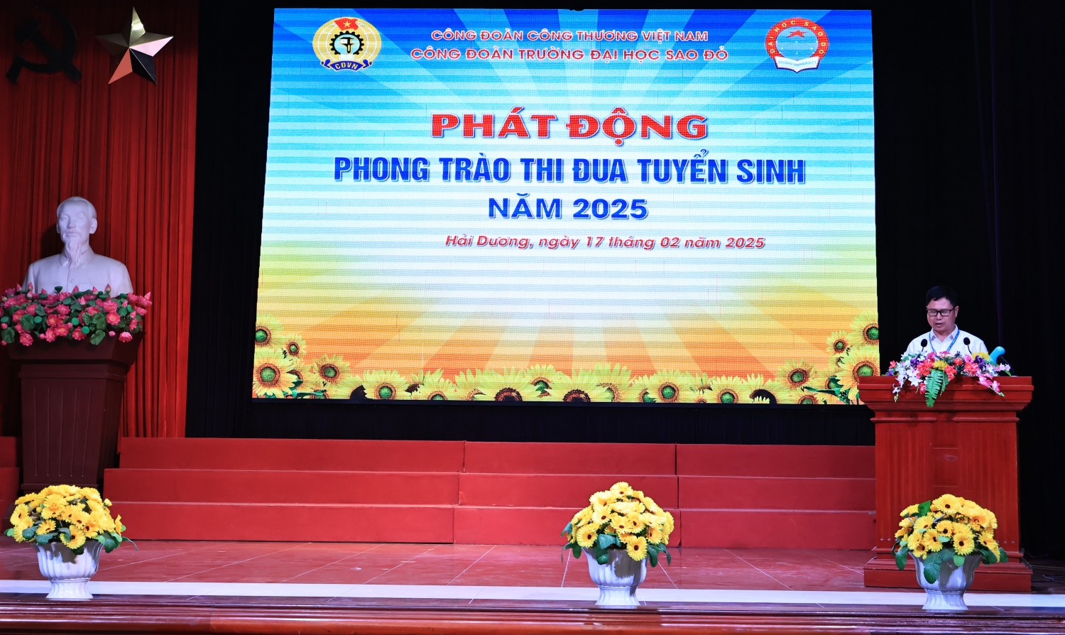 Chiều ngày 17/02/2025, Công đoàn Trường Đại học Sao Đỏ tổ chức phát động phong trào thi đua tuyển sinh năm 2025 trong toàn thể cán bộ, viên chức Nhà trường. Tham dự có NGƯT.TS Nguyễn Thị Kim Nguyên - Phó Bí thư Đảng ủy, Hiệu trưởng, đồng chí Cao Văn Biên - Chủ tịch Công đoàn Trường cùng các đồng chí trong Ban thường vụ Đảng ủy, Ban Giám hiệu và toàn thể cán bộ, viên chức Nhà trường.