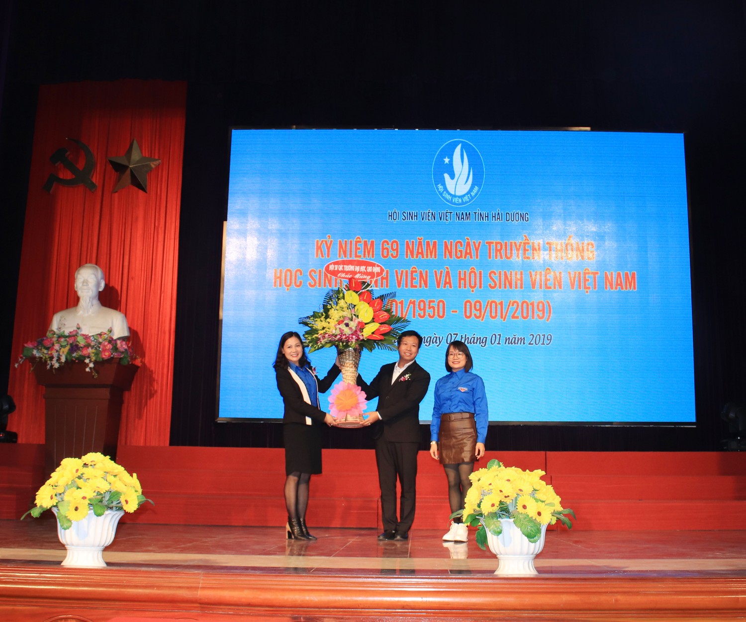 Đồng chí Trịnh Ngọc Ánh – Phó Bí thư Tỉnh đoàn, Chủ tịch Hội sinh viên Việt Nam tỉnh Hải Dương tặng hoa cảm ơn lãnh đạo Công ty Cổ phần giáo dục Tomorrow Việt Nam, Viện Đào tạo tinh thần Quốc tế IYF