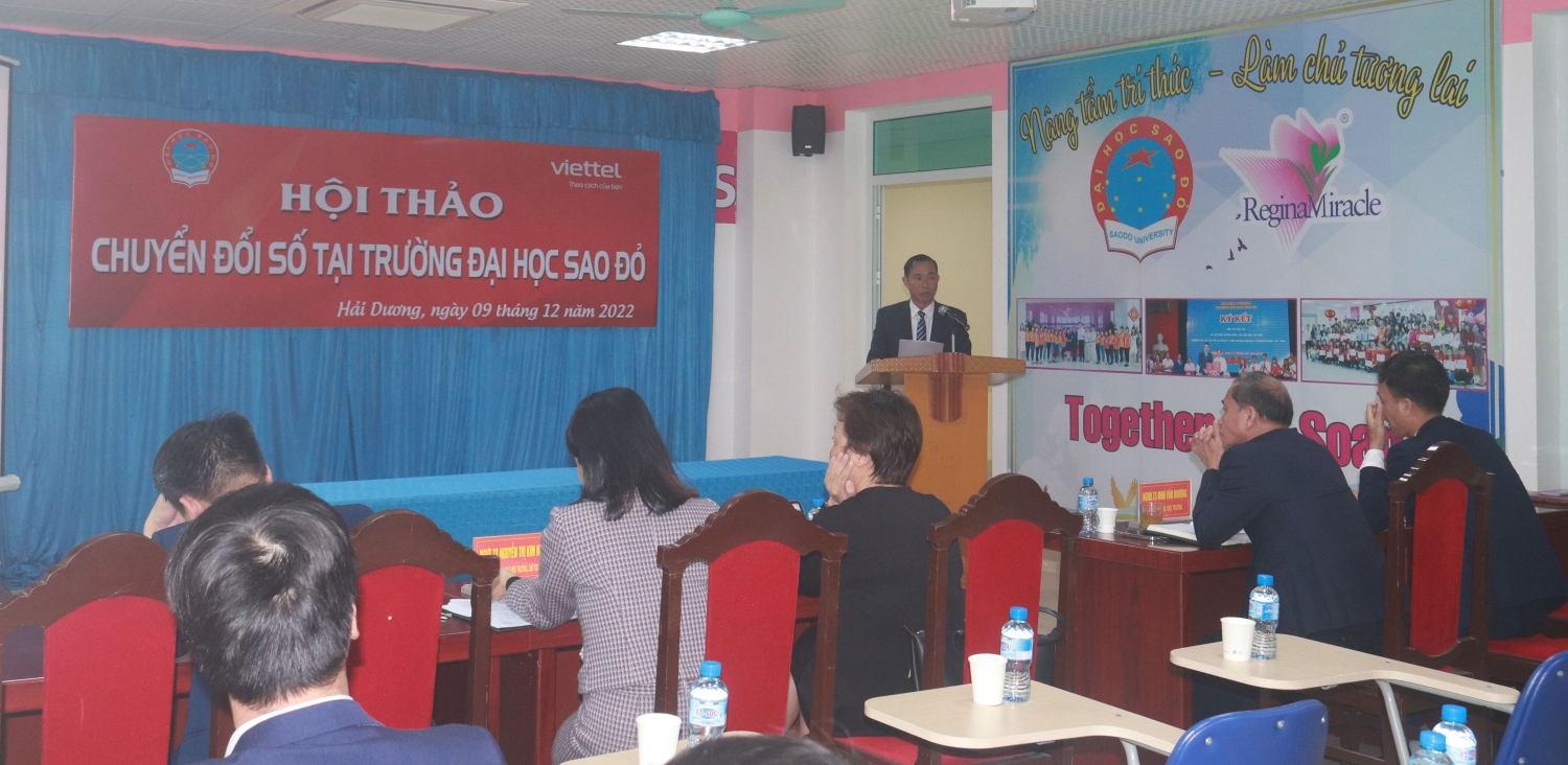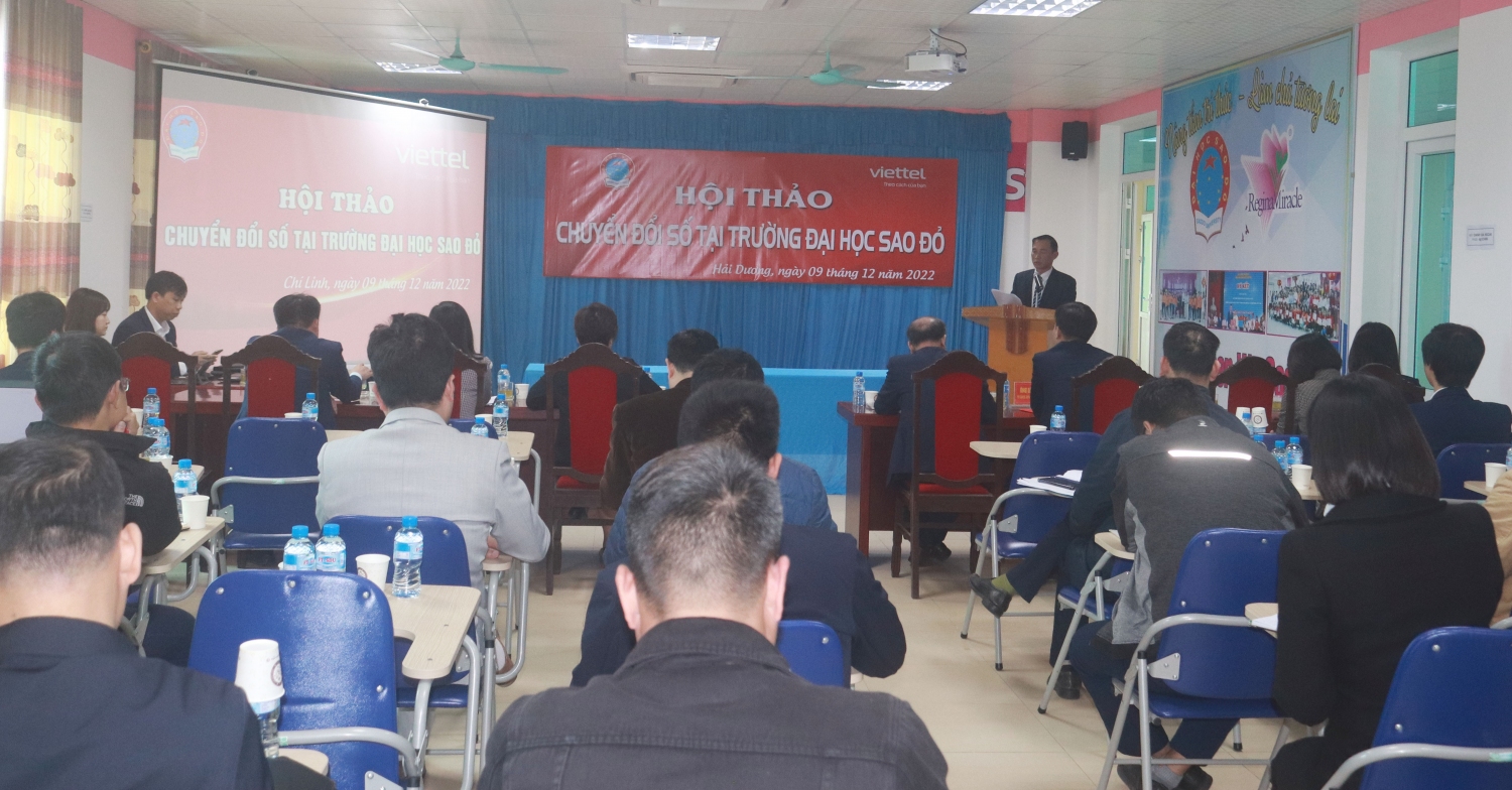 Nhằm đẩy mạnh chuyển đổi số trong giáo dục, xây dựng trường đại học thông minh trong thời kỳ cách mạng công nghiệp 4.0. Ngày 9/12/2022, Trường Đại học Sao Đỏ phối hợp với Tập đoàn công nghiệp viễn thông quân đội Viettel tổ chức Hội thảo chuyển đổi số tại trường. Tham dự hội thảo có Bà Phạm Thị Ngọc Lan - Giám đốc Trung tâm Giải pháp Giáo dục số - Tổng Công ty Giải pháp Doanh nghiệp Viettel; Ông Lê Hồng Phong - Phó Giám đốc Giải pháp CNTT - Viettel Hải Dương và các chuyên viên tập đoàn Viettel. Về phía nhà trường có NGND. TS. Đinh Văn Nhượng - Bí thư Đảng ủy, Hiệu trưởng, các đồng chí trong Hội đồng trường; Ban Giám hiệu; trưởng, phó các đơn vị và đại diện cán bộ, giảng viên, sinh viên trong lĩnh vực công nghệ thông tin của trường.