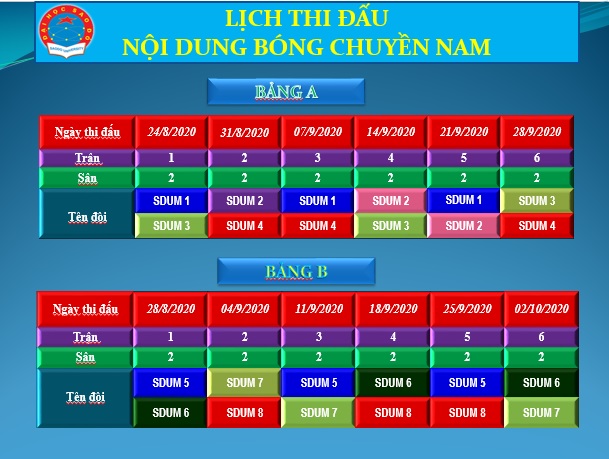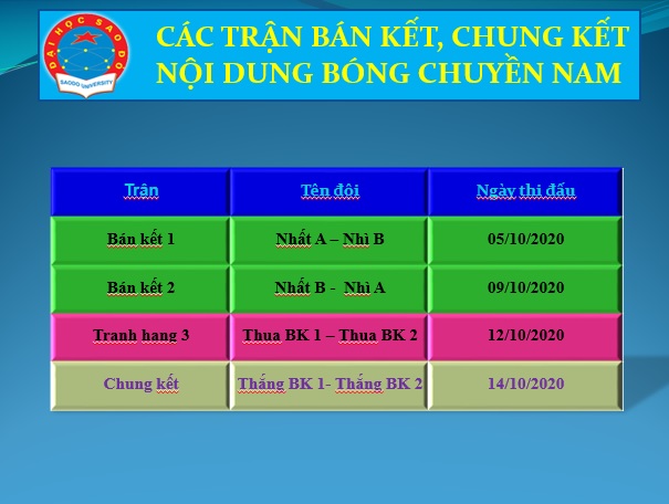 Lịch thi đấu các trận bán kết, chung kết nội dung bóng chuyền nam          Trận thi đấu đầu tiên giữa hai đội: SDUM1 và SDUM3 sẽ được diễn ra vào hồi 16 giờ ngày 24/8/2020.