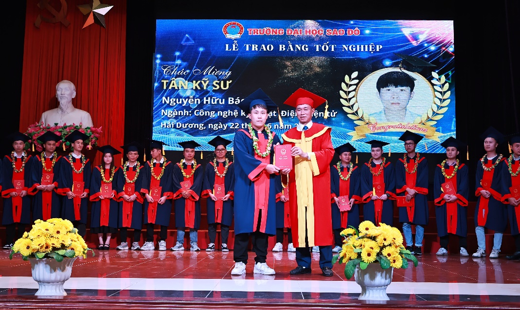 Thay mặt cho các sinh viên tốt nghiệp, tân kỹ sư Lê Việt Hùng bày tỏ niềm vui, niềm xúc động và gửi lời tri ân sâu sắc đến các thầy, cô giảng dạy, các cán bộ và lãnh đạo Nhà trường và hứa tiếp tục phấn đấu không ngừng, vận dụng kiến thức đã được lĩnh hội để áp dụng vào cuộc sống, xứng đáng là sinh viên Trường Đại học Sao Đỏ - Ngôi trường có bề dày truyền thống đào tạo, là điểm đến đáng tin cậy, tiếp tục tạo dựng con đường thành công cho những thế hệ tương lai của đất nước.