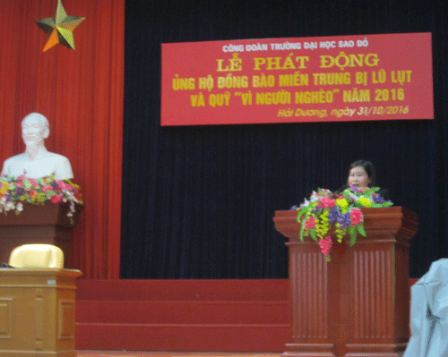 Phát biểu tại lễ phát động TS. Nguyễn Thị Kim Nguyên – Phó Hiệu trưởng, Chủ tịch Công đoàn trường cho biết: Tính đến hết ngày 18/10/2016 các tỉnh miền Trung đã có 45 người bị chết và mất tích, 200.000 ngôi nhà bị ngập, bị đổ sập, cuốn trôi, 4600 ha lúa, hoa màu và cây công nghiệp bị mất trắng, nhiều trường học, bệnh viện và các công trình công cộng bị hư hỏng, ngập lụt, nhiều tuyến đường huyết mạch giao thông bị cắt đứt, nhiều vùng vẫn đang bị cô lập trong biển lũ, ước tính tổng thiệt hại lên tới hàng nghìn tỷ đồng. Tình cảnh của người dân các tỉnh miền Trung hiện nay vô cùng khó khăn, người dân đang vật lộn chống chọi với lũ. Lũ lụt đã khiến cho nhiều gia đình, cụ già, trẻ em lâm vào cảnh khó khăn cùng cực, mất người thân, thiếu lương thực, nước uống và không còn mái ấm để che mưa, che nắng… Cùng với đó, hiện nay cả nước có gần 10% hộ nghèo, tỉnh Hải Dương còn hơn 7% hộ nghèo đang gặp những khó khăn trong cuộc sống hàng ngày.