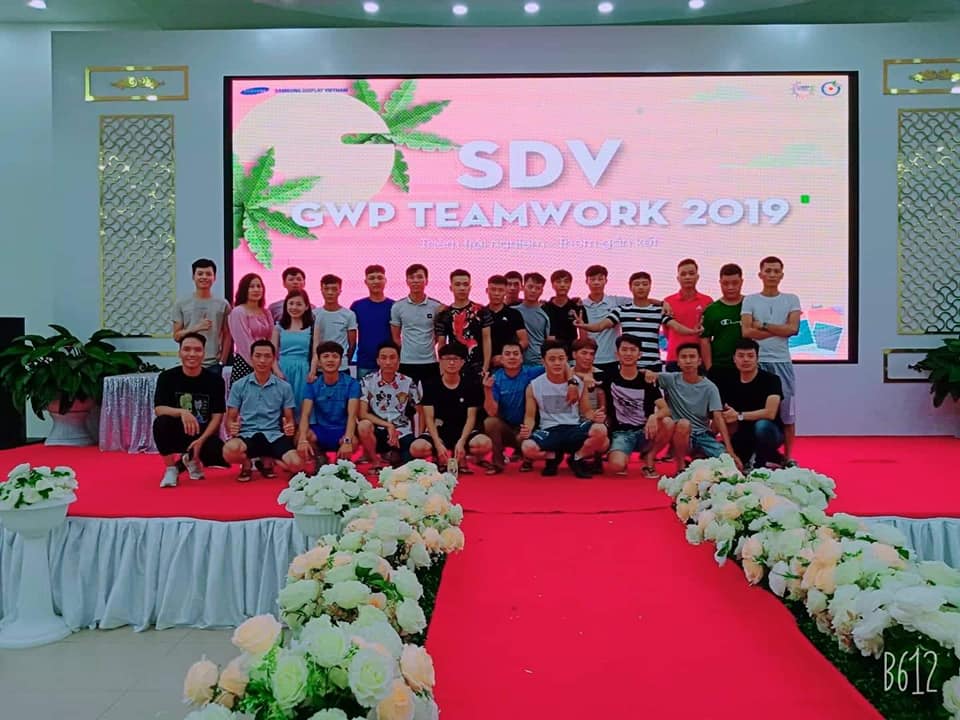 Cựu sinh viên Lê Văn Lợi (đứng thứ 6 từ trái qua) trong một hoạt động tại công ty