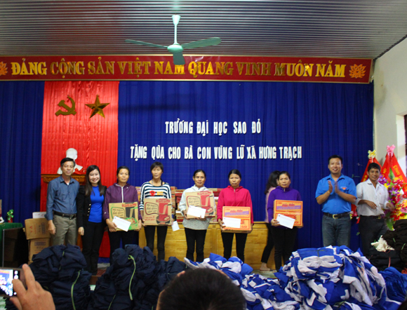 Để tấm lòng hảo tâm của cán bộ, giảng viên nhà trường đến được với đồng bào miền Trung nhanh nhất và chân thành nhất, ngày 08/11/2016, trường Đại học Sao Đỏ quyết định cử đoàn cán bộ, giảng viên, sinh viên vào miền Trung ủng hộ trực tiếp đồng bào bị bão lụt. Vượt gần 700km đoàn cán bộ, giảng viên, sinh viên nhà trường đã tới 2 xã Hưng Trach và Liên Trạch huyện Bố Trạch, Quảng Bình trao 70 suất quà trị giá 21 triệu đồng, 70 thùng mì tôm và hơn 8.500 quần áo mới các loại cho bà con và các em học sinh. Chuyến đi dài với những con đường đi khó khăn, nhưng đoàn cán bộ, giảng viên nhà trường luôn thấy phấn khởi vì đã đưa những món quà nhỏ bé đến tay người dân vùng lũ.