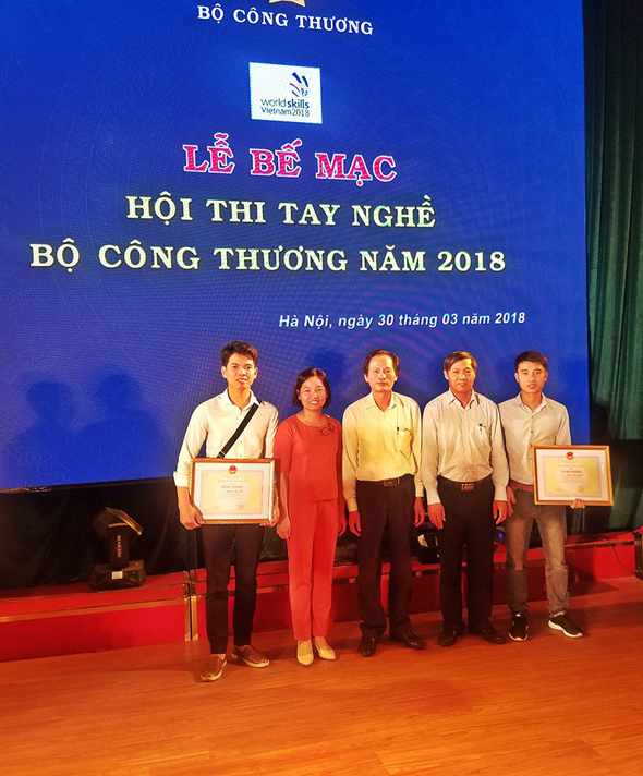 Sinh viên Phạm Văn Hải (đứng bên trái) giành giải Nhì Hội thi tay nghề Bộ Công Thương 2018