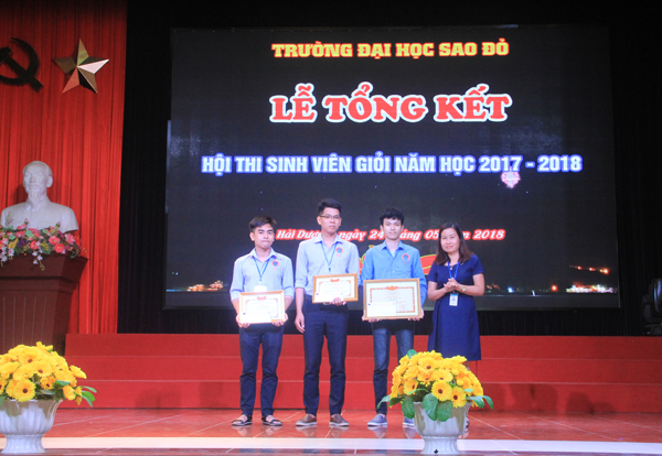 Sinh viên Nguyễn Văn Hải (đứng thứ hai trừ trái sang) được Ban giám hiệu nhà trường khen thưởng tại Lễ tổng kết Hội thi sinhh viên giỏi năm học 2017-2018