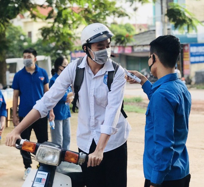 Các tình nguyên viên đo thân nhiệt và sát khuẩn tay cho thí sinh trước khi vào địa điểm thi