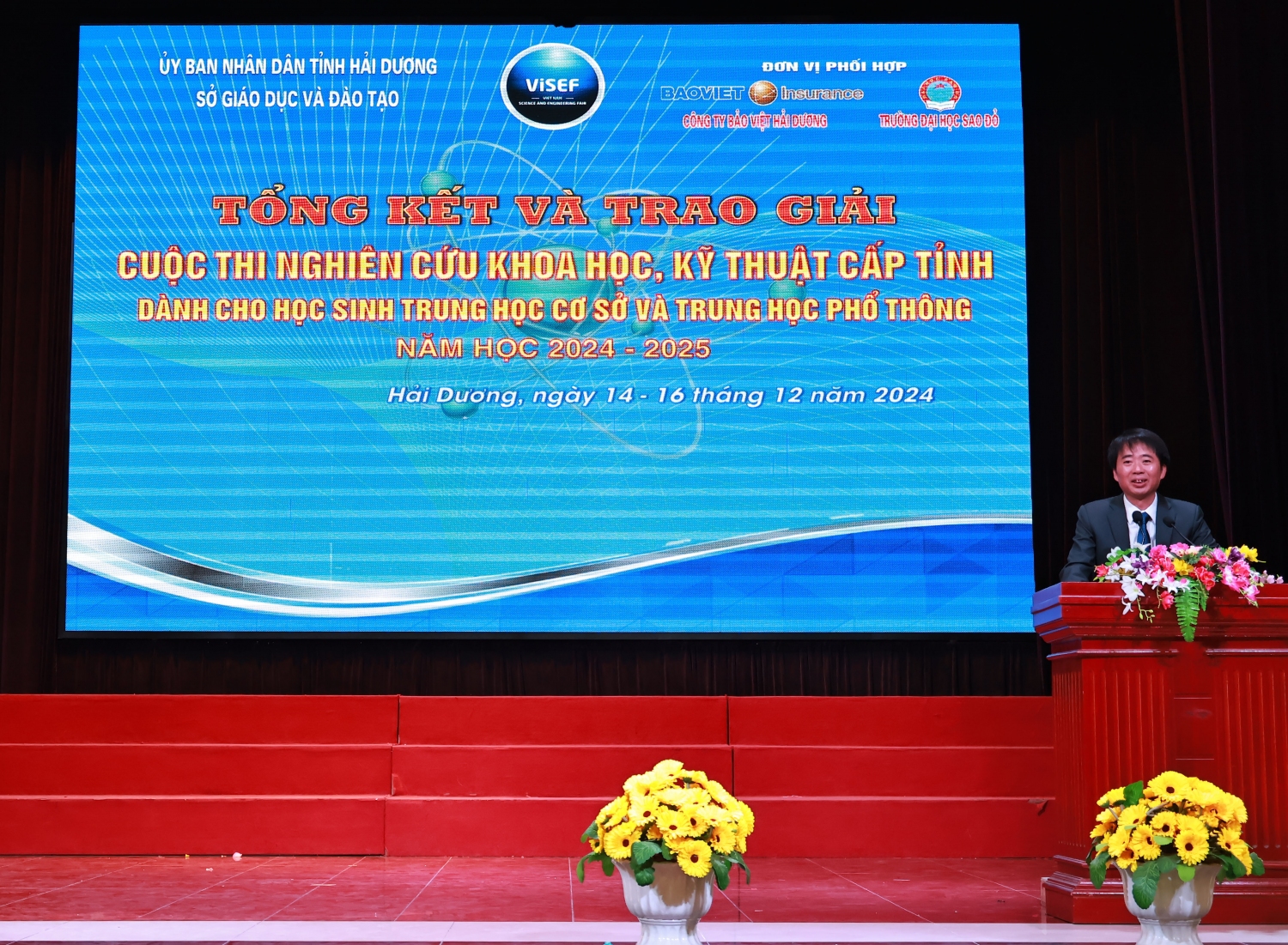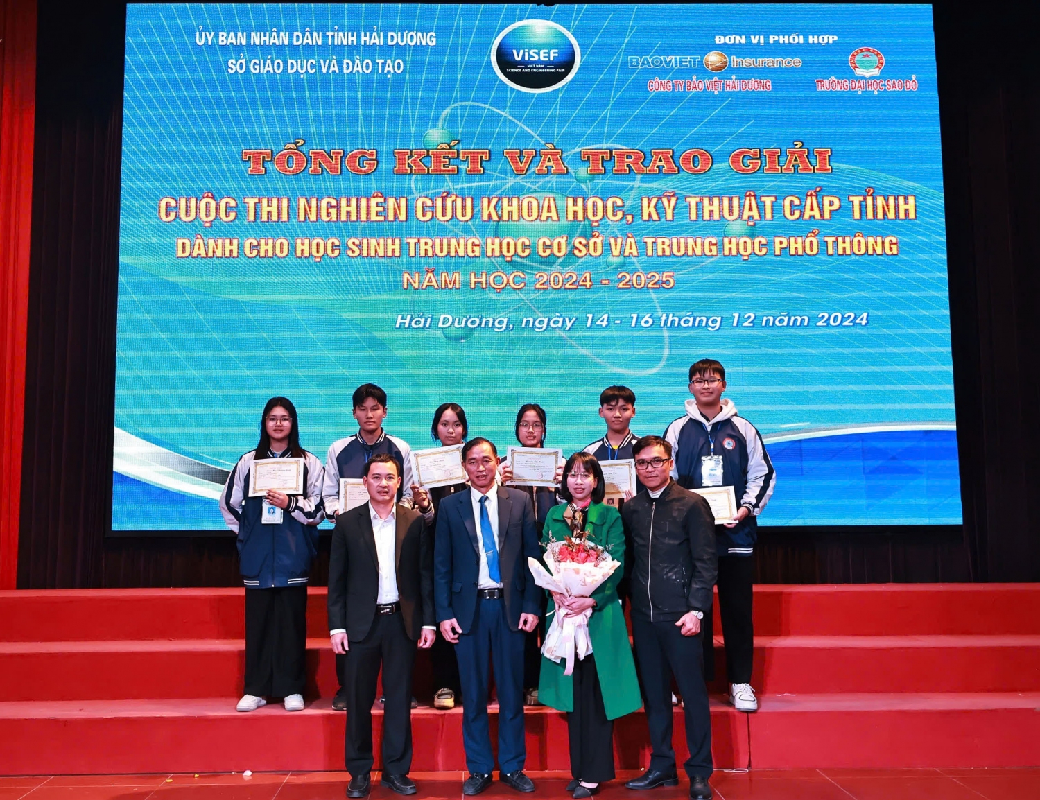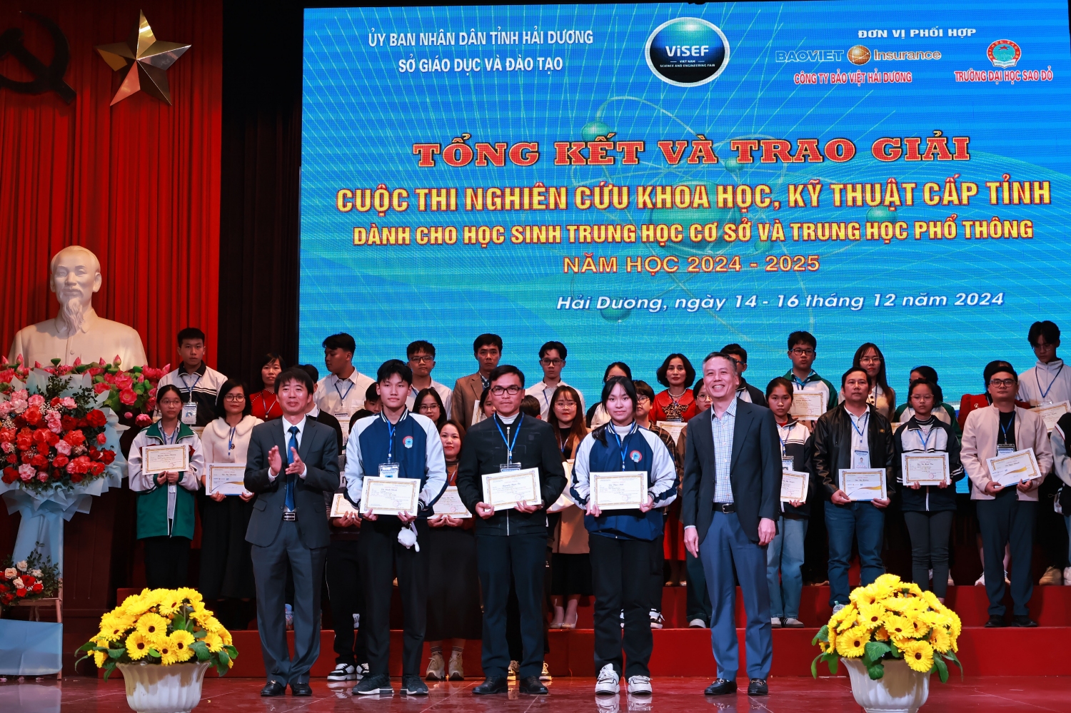 Chiều ngày 16/12/2024, tại Trường Đại học Sao Đỏ, Sở Giáo dục và Đào tạo tỉnh Hải Dương đã tổ chức Tổng kết và trao giải cuộc thi. Tham dự và chỉ đạo có đồng chí Lương Văn Việt – Giám đốc Sở Giáo dục và Đào tạo, đồng chí Đỗ Duy Hưng – Phó Giám đốc Sở Giáo dục và Đào tạo cùng lãnh đạo chuyên viên phòng Giáo dục trung học tỉnh Hải Dương; Đại diện đơn vị đăng cai – Trường Đại học Sao Đỏ có TS. Đỗ Văn Đỉnh – Phó Hiệu trưởng. Ông Nguyễn Đức Cường – Giám đốc Công ty Bảo Việt Hải Dương cùng các thầy, cô trong Ban Giám khảo và các thầy giáo, cô giáo, các em học sinh đến từ các trường THCS, THPT trên toàn tỉnh có dự án dự thi.