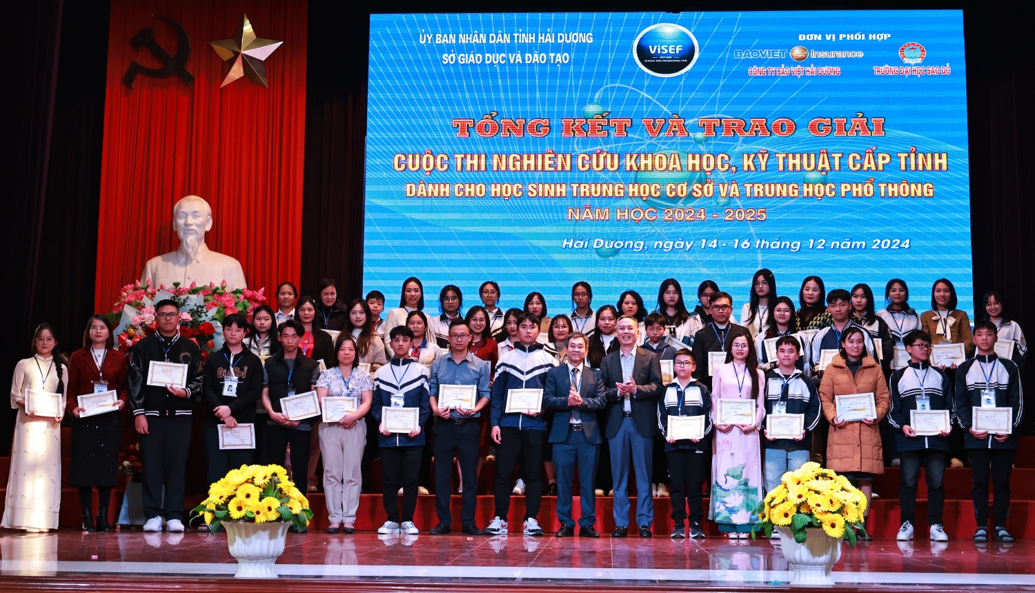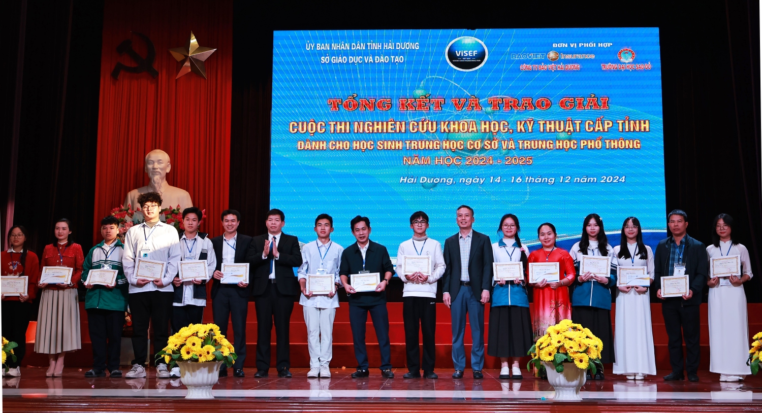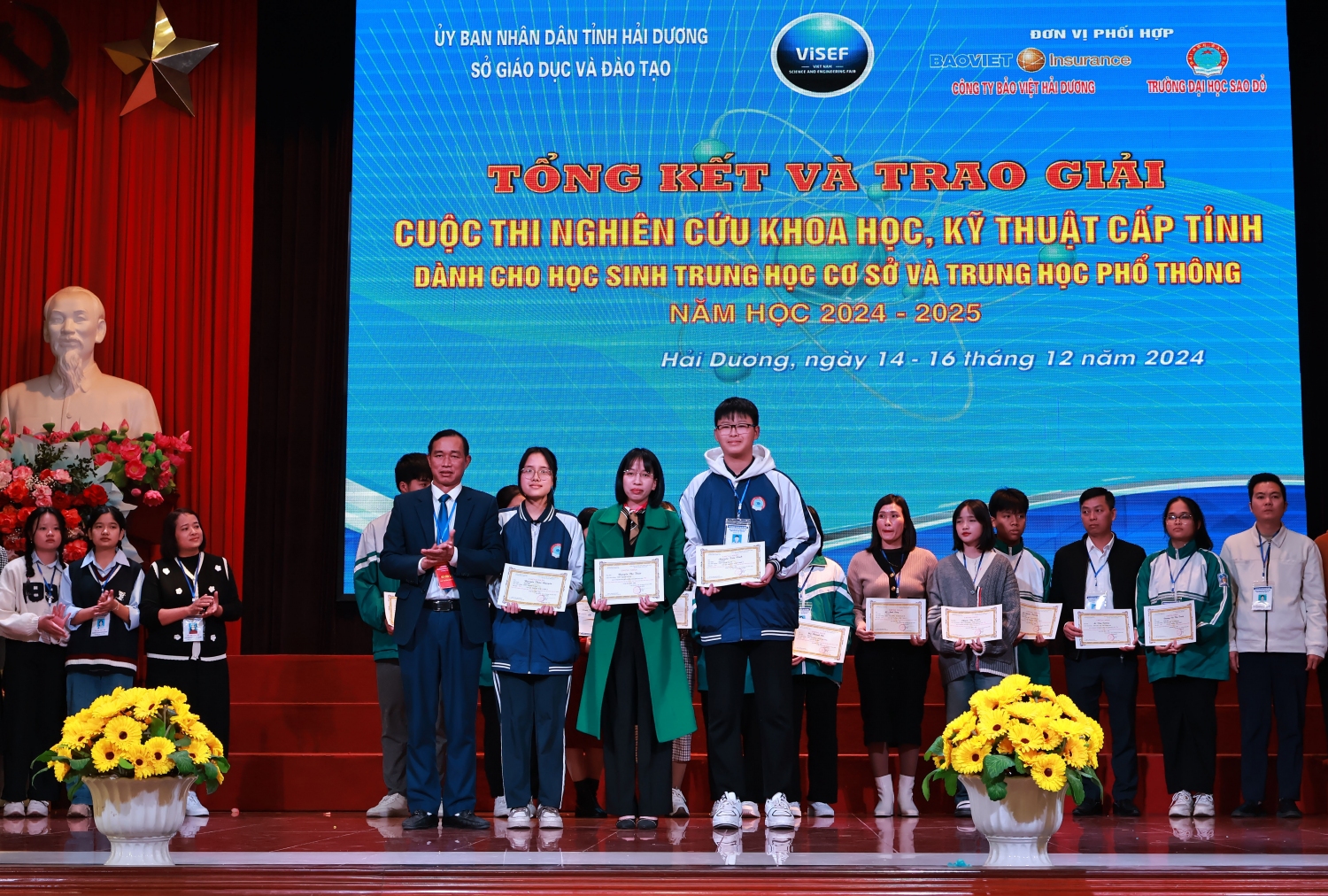 Chiều ngày 16/12/2024, tại Trường Đại học Sao Đỏ, Sở Giáo dục và Đào tạo tỉnh Hải Dương đã tổ chức Tổng kết và trao giải cuộc thi. Tham dự và chỉ đạo có đồng chí Lương Văn Việt – Giám đốc Sở Giáo dục và Đào tạo, đồng chí Đỗ Duy Hưng – Phó Giám đốc Sở Giáo dục và Đào tạo cùng lãnh đạo chuyên viên phòng Giáo dục trung học tỉnh Hải Dương; Đại diện đơn vị đăng cai – Trường Đại học Sao Đỏ có TS. Đỗ Văn Đỉnh – Phó Hiệu trưởng. Ông Nguyễn Đức Cường – Giám đốc Công ty Bảo Việt Hải Dương cùng các thầy, cô trong Ban Giám khảo và các thầy giáo, cô giáo, các em học sinh đến từ các trường THCS, THPT trên toàn tỉnh có dự án dự thi.