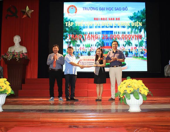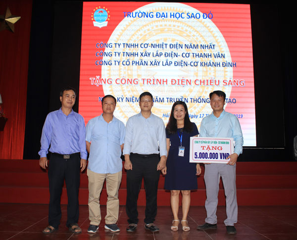 Với phương châm đẩy mạnh hợp tác và phát triển cùng doanh nghiệp, Trường Đại học Sao Đỏ đã và đang xây dựng mối quan hệ ngày càng nồng ấm hơn với các doanh nghiệp, đẩy mạnh các mối quan hệ hợp tác trong đào tạo và sử dụng nguồn nhân lực sau đào tạo. Nhân dịp niệm 50 năm Truyền thống đào tạo, Nhà trường đã tiếp nhận những món quà thiết thực của doanh nghiệp góp phần xây dựng và cải tạo cơ sở vật chất, cảnh quan, môi trường làm việc và điều kiện học tập, nghiên cứu cho cán bộ giảng viên, sinh viên. Đồng hành cùng với Nhà trường trong chuỗi hoạt động hướng tới Ngày hội truyền thống này là các công ty có mối quan hệ gắn bó như: Công ty TNHH Cơ - Nhiệt điện Năm Nhất, Công ty TNHH xây lắp Điện - Cơ Thanh Vân, Công ty Cổ phần xây lắp Điện - Cơ Khánh Đình đã trao tặng Trường Đại học Sao Đỏ “Công trình điện chiếu sáng”. Món quà đã góp phần làm đẹp thêm cảnh quan khuôn viên Nhà trường.