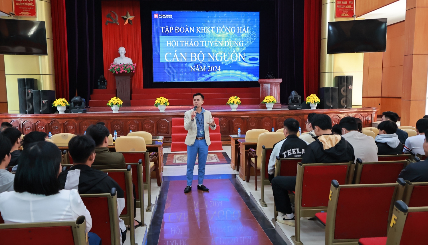 Tại buổi tuyển dụng, sinh viên Nhà trường đã được nghe đại diện Tập đoàn giới thiệu về Tập đoàn Khoa học kỹ thuật Hồng Hải, là Tập đoàn quốc tế chuyên nghiên cứu và chế tạo trong lĩnh vực sản phẩm điện tử với quy mô lớn, phát triển nhanh, được đánh giá cao trên toàn thế giới, xếp hạng thứ 109 trong các doanh nghiệp trên toàn cầu. Đến nay, Tập đoàn có khoảng 800.000 cán bộ, nhân viên đang làm việc trong hàng trăm công ty tại các quốc gia như: Trung Quốc, Nhật Bản, các nước Đông Nam Á, châu Âu và châu Mỹ,…Tập đoàn Hồng Hải đầu tư khoảng 5 tỷ USD vào các dự án tại Việt Nam, đem lại cơ hội việc làm lớn cho lao động Việt Nam với chính sách tiền lương và chế độ phúc lợi tốt.