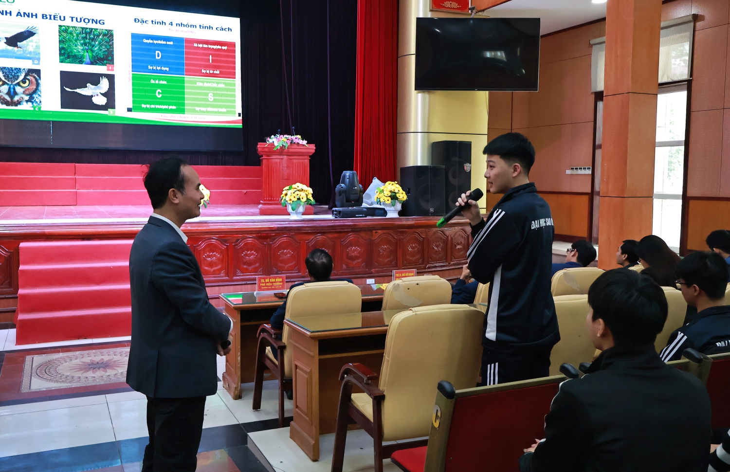 Sinh viên giao lưu cùng diễn giả          Buổi tập huấn kết thúc trong không khí vui vẻ, các trao đổi của sinh viên đã được diễn giả phân tích, trả lời một cách thấu đáo, giúp các em có nhiều bài học quý giá về khả năng quan sát và nhận định tính cách của bản thân và người khác, tạo hành trang khởi nghiệp vững chắc trong tương lai.