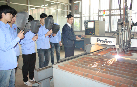 Thầy và trò trong giờ thực nghiệm lập trình điều khiển máy cắt Plasma