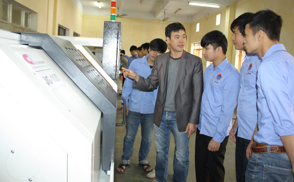 Sinh viên trong giờ thực hành truyền dữ liệu từ máy tính sang máy tiện băng nghiêng CNC JG-100