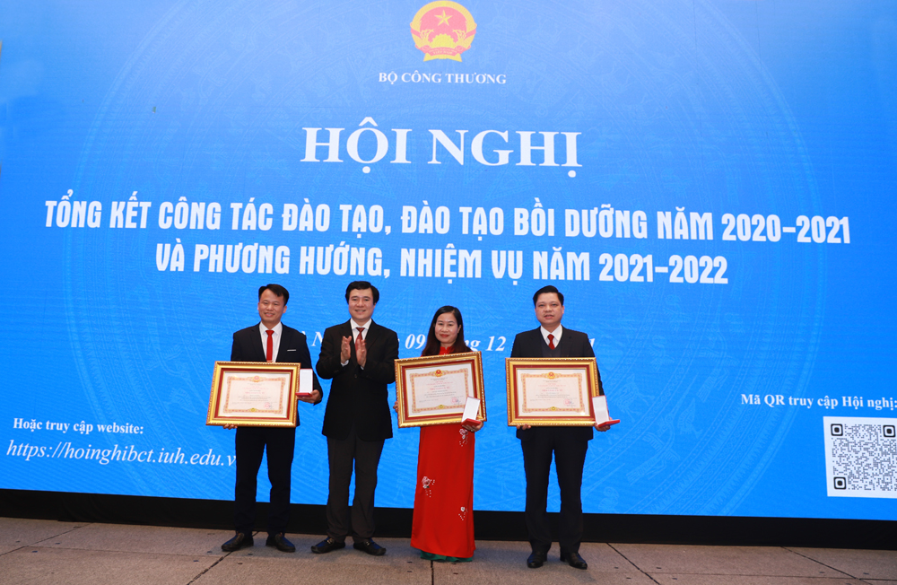 TS Nguyễn Thị Kim Nguyên – Phó Bí thư Đảng ủy, Phó Hiệu trưởng và  TS Nguyễn Trọng Các – Chủ tịch Hội đồng Trường Đại học Sao Đỏ (thứ 1 từ trái sang) vinh dự đón nhận danh hiệu Nhà giáo Ưu tú tại Hội nghị tổng kết công tác đào tạo năm học 2020-2021