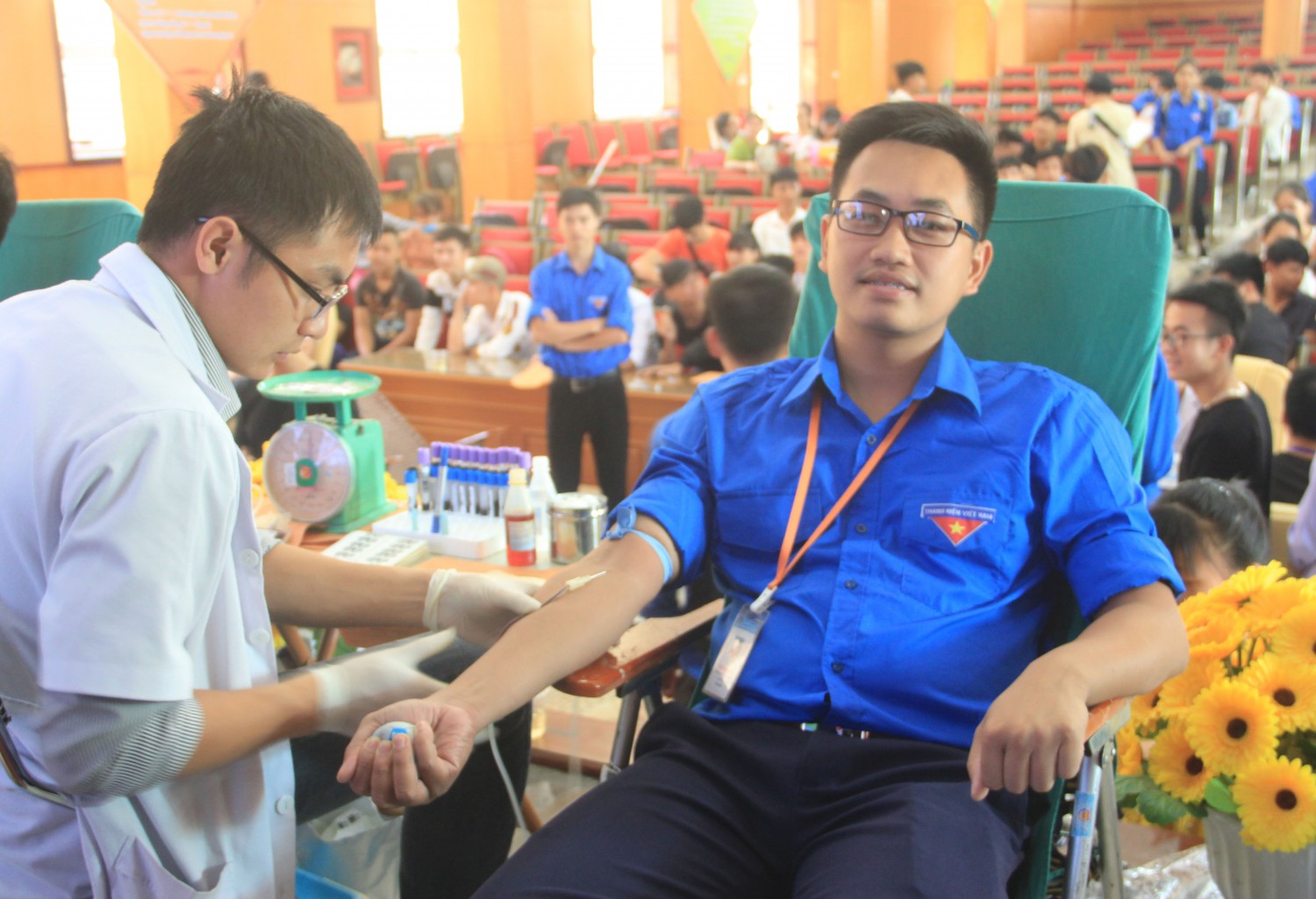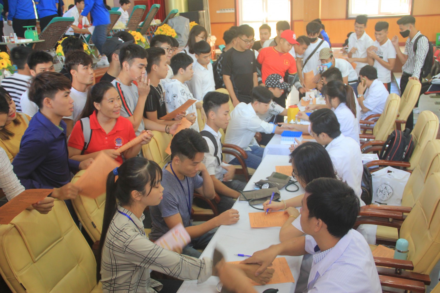 Ngay từ sáng sớm, hàng trăm sinh viên đã có mặt tại hội trường với những khuôn mặt rạng rỡ và nụ cười tươi trẻ. Mặc dù phải xếp hàng giữa cái nóng rát để chờ đến lượt nhưng số lượng sinh viên tham gia ngày càng đông. Bạn Nguyễn Xuân Khánh, tân sinh viên Khoa Ô tô lần đầu tham gia hiến máu cho biết: “Mặc dù khá hồi hộp và sợ kim tiêm nhưng em vẫn quyết định tham gia hiến máu. Là sinh viên thì đây là dịp không nên bỏ lỡ vì những việc làm thiết thực như hiến máu rất có ích để hỗ trợ cộng đồng.”
