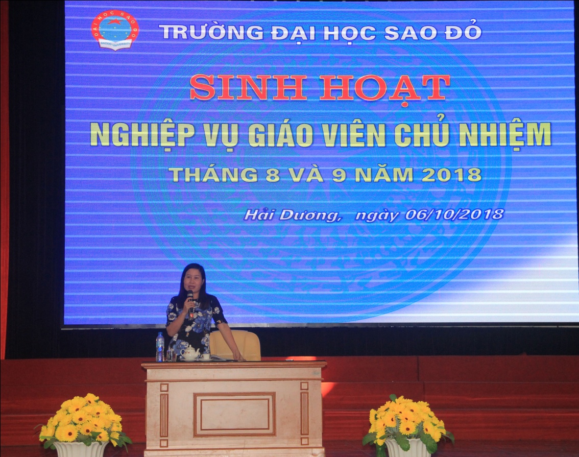 Nhằm đánh giá tình hình thực hiện công tác giáo viên chủ nhiệm tháng 8 và 9 năm 2018, đề ra phương hướng, nhiệm vụ trong những tháng tiếp theo, chiều ngày 06/10/2018, Trường Đại học Sao Đỏ tổ chức sinh hoạt nghiệp vụ công tác giáo viên chủ nhiệm. Chủ trì buổi sinh hoạt có TS. Nguyễn Thị Kim Nguyên – Phó Hiệu trưởng nhà trường; Trưởng các phòng Đào tạo, Tài chính kế toán, Công tác sinh viên, phó trưởng khoa phụ trách sinh viên và toàn thể giảng viên chủ nhiệm các lớp trong toàn trường.